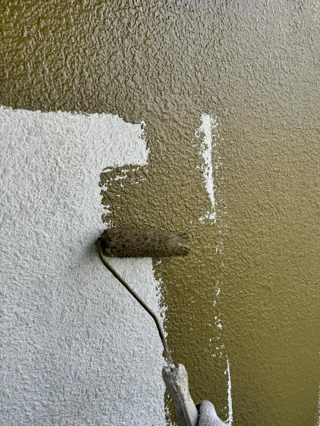 今回のプロジェクトでは、外壁塗装としてプレミアムシリコンを使用し、中塗りを進行しています。この工程は、建物の美観を高めるだけでなく、耐久性を向上させ、長期間にわたって外観を維持するために非常に重要です。プレミアムシリコンは、その優れた耐候性と防水性から、多くのお客様に選ばれている人気の高い塗料です。