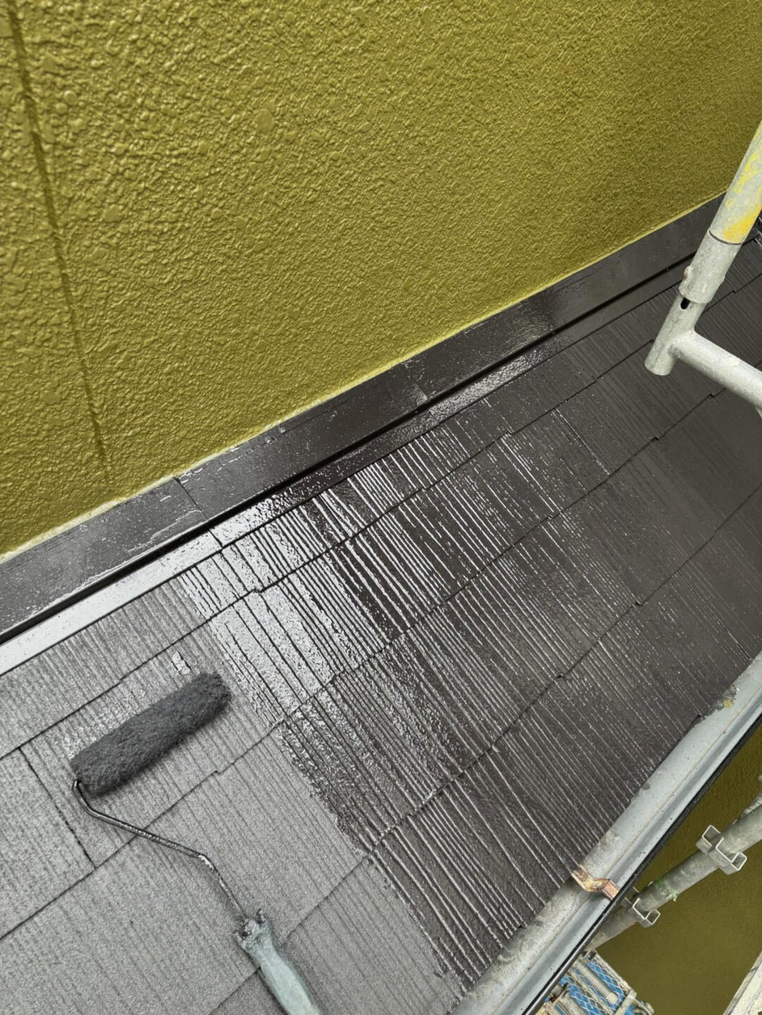 施工中の屋根塗装では、クールタイトを使用した上塗り作業が進行中です。クールタイトは、その優れた耐久性と反射性により、屋根の温度を効果的に下げることができる塗料です。このペイントは、夏の強い日差しから建物を守り、室内温度の上昇を抑えることでエネルギーの効率的な使用をサポートします。