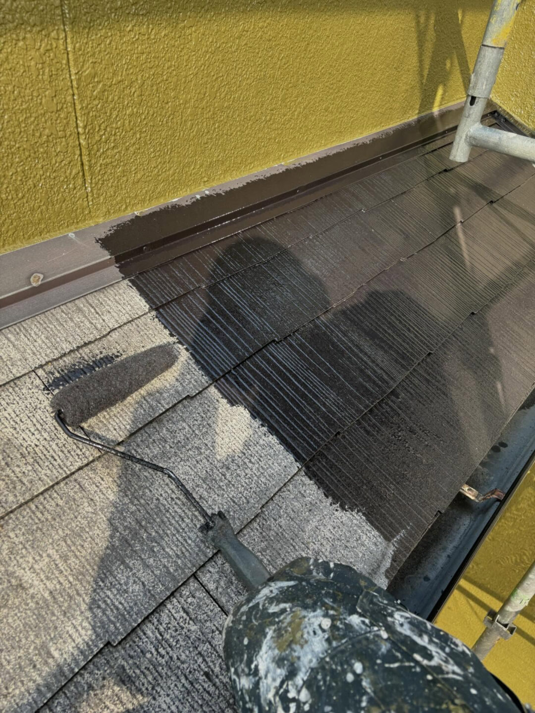 涼しい秋の日のことです。職人たちが丁寧に屋根の塗装作業を行っていました。この日は「クールタイト」という特別な塗料を使用しており、仕事の中盤、いわゆる中塗りの工程に入っていました。この工程では、屋根を保護しつつ、最終的な外観を左右する重要な作業が進められています。職人たちは細心の注意を払いながら、毎筆ごとに思いを込めて塗料を均一に塗り広げています。